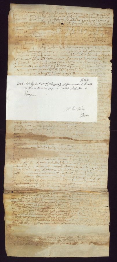 Documento composto da una pergamena cucita con un&39;altra pergamena sul lato più corto