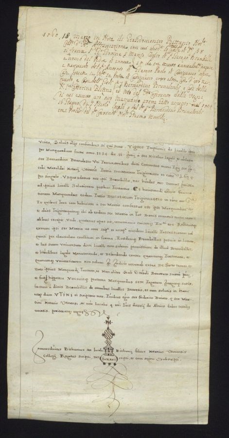 In note di Giandomenico Bittunio nodaro collegiato d' Udine. Affrancazione, con cui mediante lo sborso di capitale di ducati 38 si franca l'egregio giovine ser Marzio figlio di ser Giacopo Branbilla a nome del padre di annue lire 15 che era tenuto annualmente pagare a Marquardo del quondam Antonio di Giacopo Paolo di Cussignacco sopra casa situata in Udine in porta di Cussignacco presso altra casa d'esso Marquardo, e casa degli eredi quondam ser Bernardino Brunaleschi, e casa della nobile signora Catterina Filitina, ed orto del venerando convento della Vigna di cui annuo pro esso Marquardo aveva fatto acquistò nel 1534 16 giugno dal signor Nicolò Legale, e dal detto ser Bernardino Brunaleschi come Procuratori del detto convento Nodaro Giacomo Moroldi