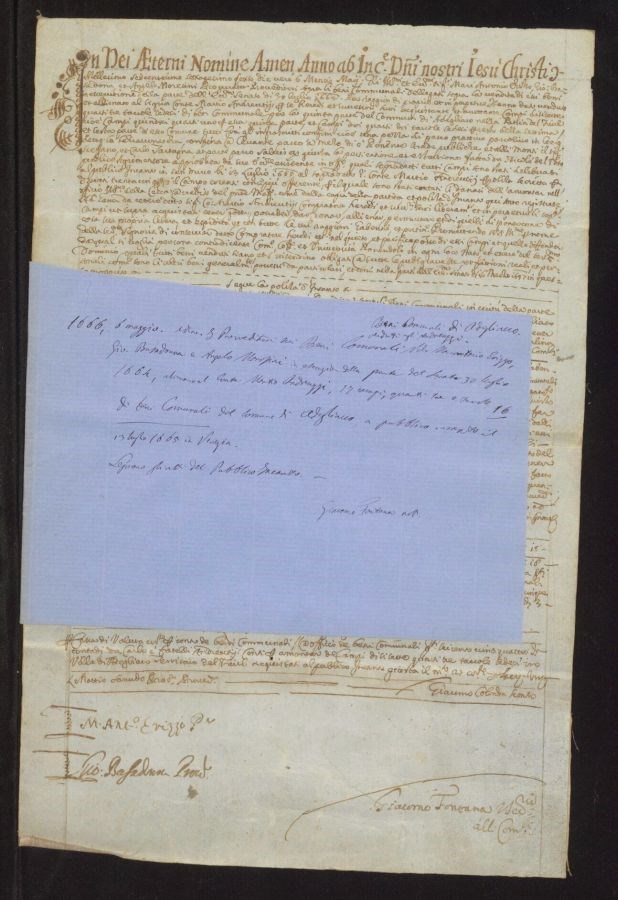 I Provveditori sui Beni Comunali [...] Marcantonio Erizzo, Giovanni Basadonna e Angelo Morosini in <esercizio> della ponte del Senato 30 luglio 1664, alienano al Conte Martio Andreuzzi, 17 campi, <quanti> tre e tavole 16 di beni comunali del Comune di Adegliacco a pubblico incanto il 13 luglio 1665 in Venezia. Seguono gli atti del pubblico incanto