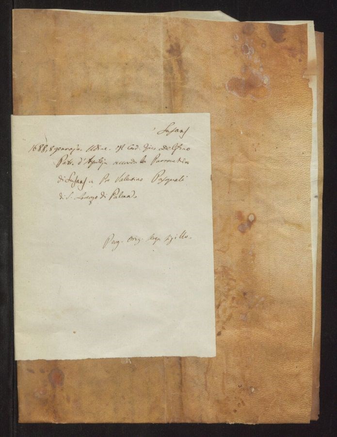 Il Cardinale Giovanni Delfino Patriarca d'Aquileja accorda la Parrocchia di Susans a Pre Valentino Pasognali di San Lorenzo di Palma