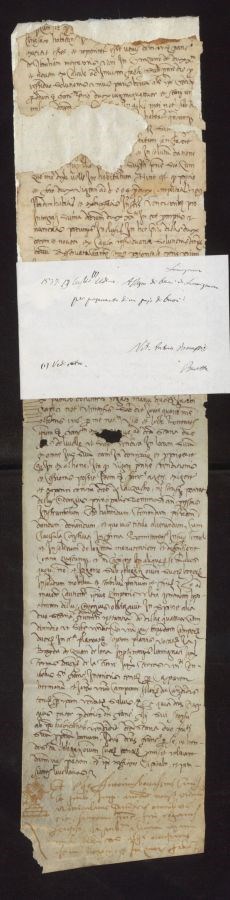 Non sono stati eseguiti interventi di restauro Sul retro della parte superiore è stato incollato un foglio come rinforzo per la pergamena. La parte superiore del documento ha sezioni illeggibili