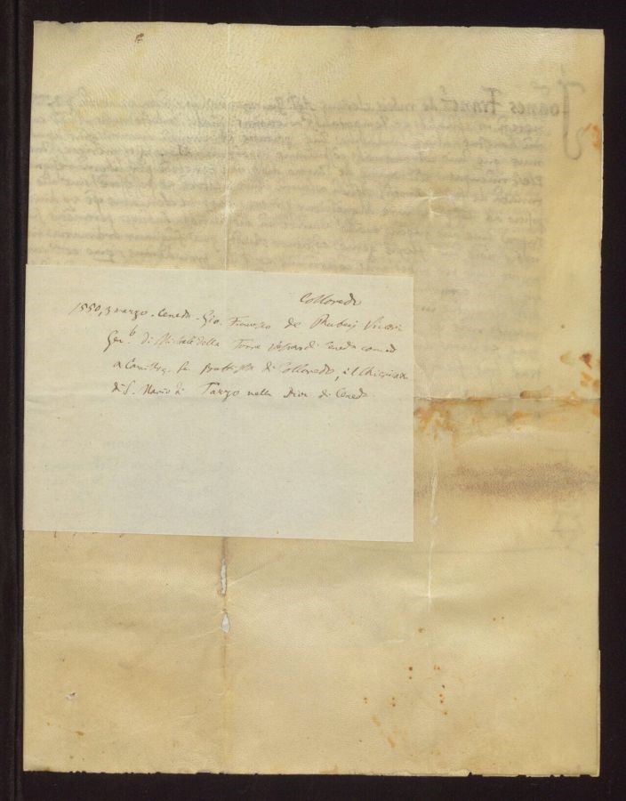 Giovanni Francesco De Rubeis vicario generale di Michele della Torre vescovado di Ceneda concede a Camillo quondam ser Battista di Colloredo, il chiericato di Santa Maria di Tarzo nella diocesi di Ceneda