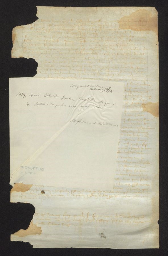 Non sono stati eseguiti interventi di restauro Presenza di lacune sul margine sinistro da roditore che coinvolgono lo specchio di scrittura e presenza di gore imbrunite