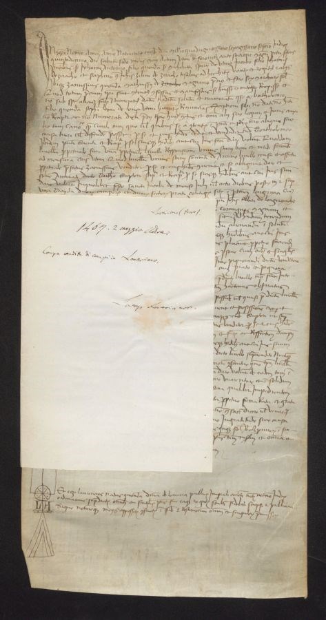 Tracce di rigatura in mina di piombo del margine dello specchio di scrittura superiore e laterale