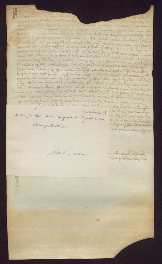 Non sono stati eseguiti interventi di restauro Ampia lacuna sul margine superiore che coinvolge lo specchio di scrittura