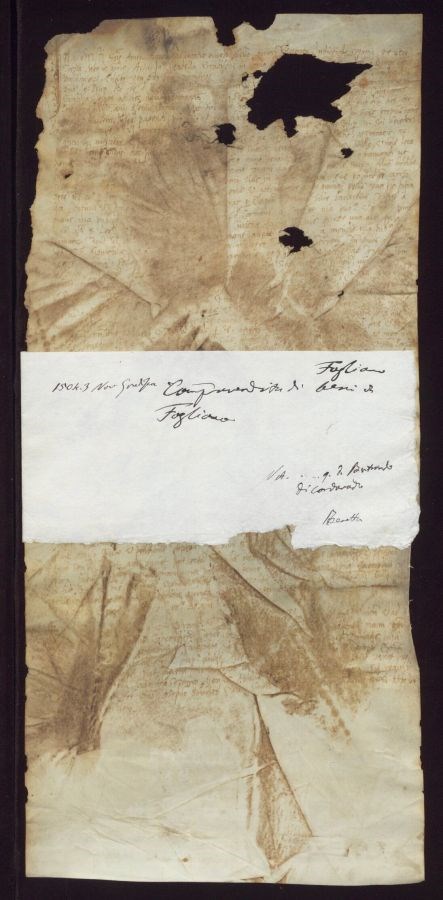 Non sono stati eseguiti interventi di restauro Forti imbrunimenti estesi su tutto il supporto, inchiostro evanito, lacune che coinvolgono lo specchio di scrittura e lacune lungo i margini superiore e sinistro del supportomargini