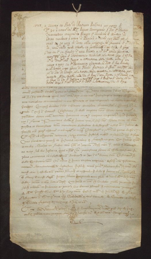 In note di Antonio Bellone per prezzo di ducati 30 a nome del nobile Pagano Savorgnano quondam Pio [...] Jacopo Tramontino compra da Biaggio quondam Michele di Martino di Torsa vendente a nome di Michele e Nicolò suoi fratelli per li quali sue pezze di terra colla pieggiaria del Comune di detta villa, una delle quali situata in pertinenza [...] villa di Campi due in [...] in Lonchis d'una pianta a sol levante strada consortiva mezo [...] campo di Giandomenico Micheluto sol a monte Campo di Nicolò di Francesco dall'Ongaro a settentrione [...] altro d'un campo e mezo in dette pertinenze chiamata la Dote di due piante a sol levado presso campo di Nicolò Antonio di [...] mezo [...] campi di Pio di Giorgio sol a monte strada consortiva a settentrione parimente, al suo [...] sulla via di Ronc d'una pianta a sol levado presso campo di Pio di Zugliano a mezo [...] campo di Badino di Tonia sol a monte campo di Nicolò di Donato di Clemente a settentrione via di Ronc