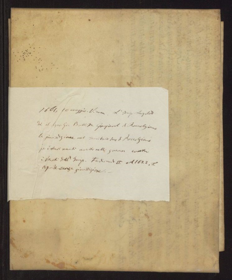 L'Imperatore Leopoldo dà al Signor Giovanni Battista Garziarol di Raccolgiano la giurisdizione nel territorio suo di Raccolgiano per i suoi meriti avuti nella guerra contro i Veneti dall'Imperatore Ferdinando II nel 1622. I° aprile senza giurisdizione
