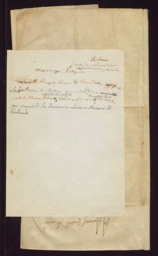 Leonello Chieregato <Chiericati> vescovo di Concordia conferisce a pre Luca pievano di Morsano le cure delle due chiese, cioè di Santa Maria Maddalena, detta del Priorato, e quella de' Santi Pietro e Silvestro, site presso la villa di Aviano, per rinunzia di pre Domenico Luciano pievano di Cordovado