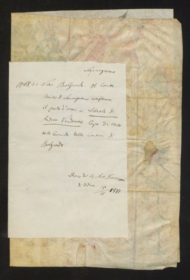 Il Conte Mario di Savorgano conferma il porto d'armi a Liberale di Andrea Vendrame Capo di cento nelle Cernide della Contea di Belgrado