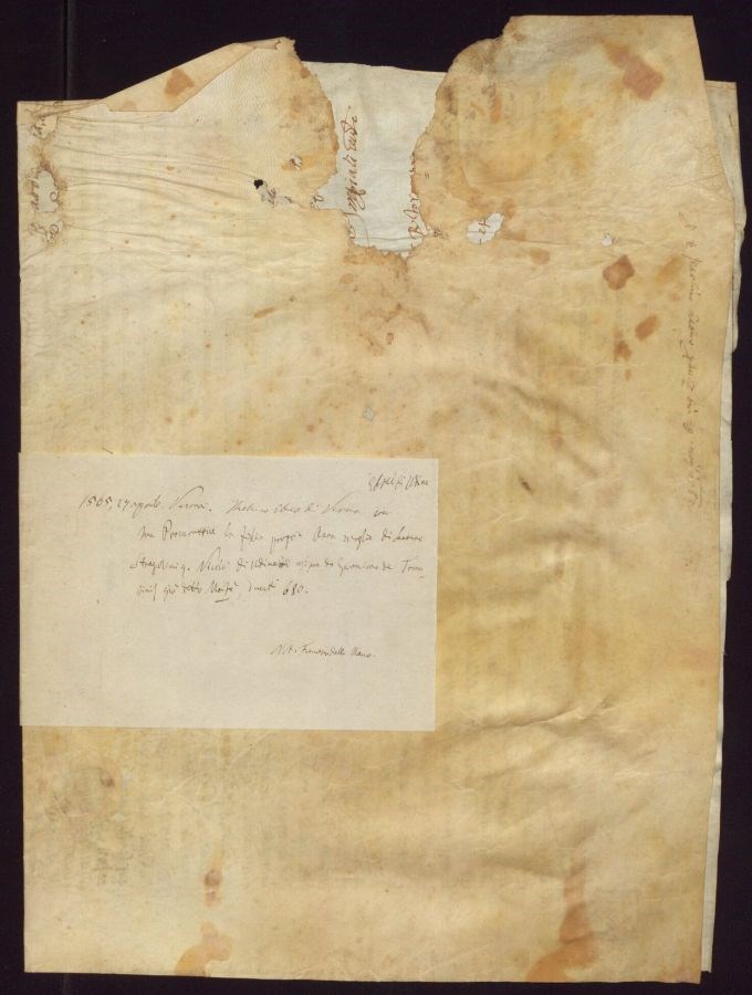 Esemplare lacerato nel bordo sinistro con perdita di parte della scrittura