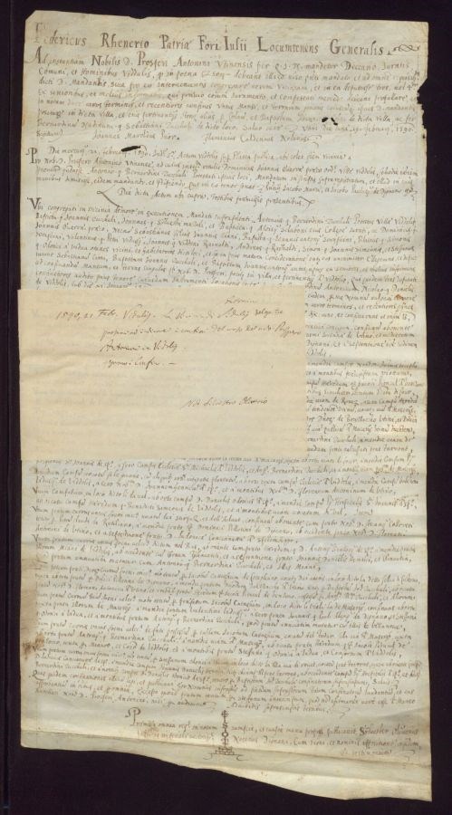 La Vicinia di Vidulis delega tre paesani ad indicare i confini del maso del nobile Prospero Antonini in Vidulis. Seguono i confini