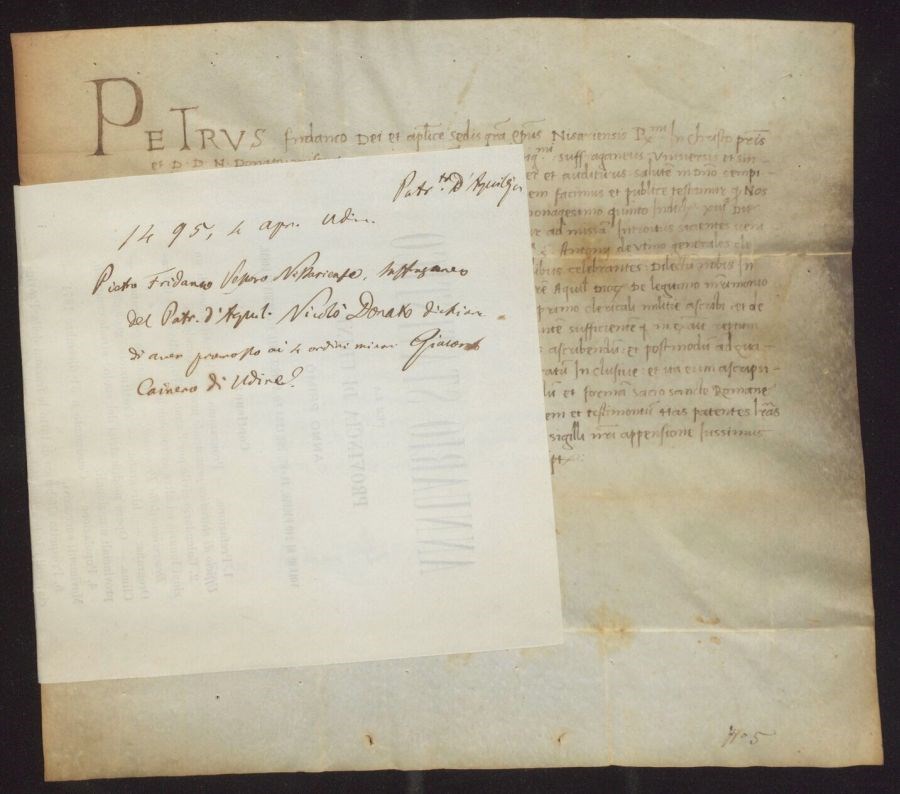 Pietro Fridanco Vescovo Nisariense, suffraganeo del Patriarca di Aquileia Nicolò Donato dichiara di aver promosso ai 4 ordini minori Giacomo Cainero di Udine