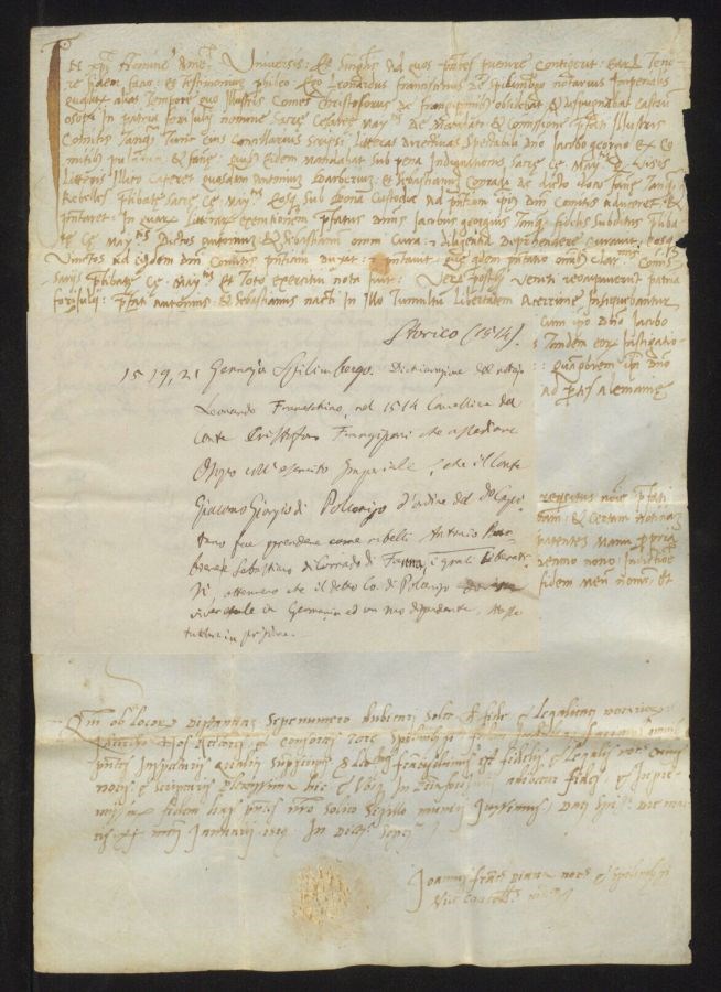 Dichiarazione del notaio Leonardo Franceschino, nel 1514 cancelliere del conte Cristoforo Frangipane che [...] Oso<p>o coll'esercito Imperiale, che il conte Giacomo Giorgio di Polcenigo d'ordine del detto Capitano fece prendere come ribelli Antonio barbiere e Sebastiano di Corrado di Fanna, i quali liberatisi si ottennero che il detto Conte di Polcenigo dovesse viver esule in Germania ed un suo dipendente stesse tutt'ora in prigionia