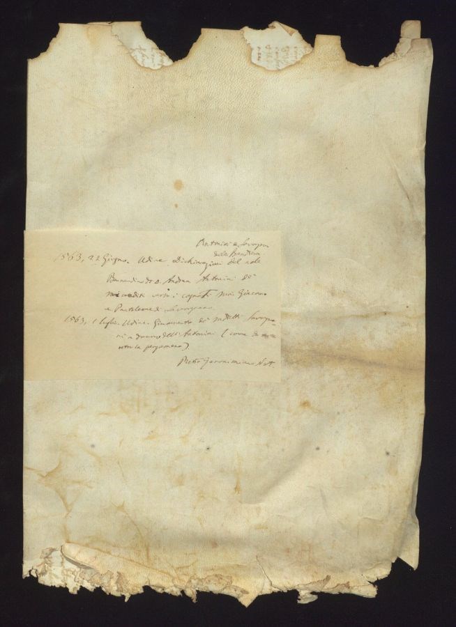 Giuramento de' suddetti Savorgnano a danno dell'Antonini (come da nota recto la pergamena)