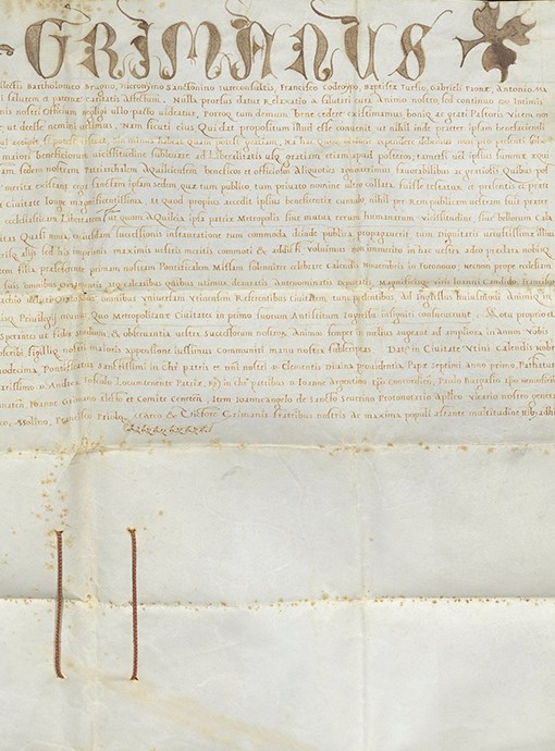 Il patriarca d'Aquileia Marino Grimani, nel primo suo ingresso in Udine, seguendo l'esempio de' suoi predecessori, dona a questa città la propria mula coi relativi bardamenti rilasciando il presente diploma