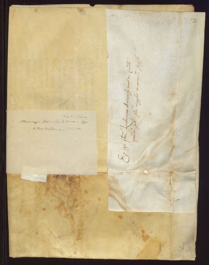 Nelle parti lacerate e lacunose della pergamena sul recto sono incollate strisce di carta