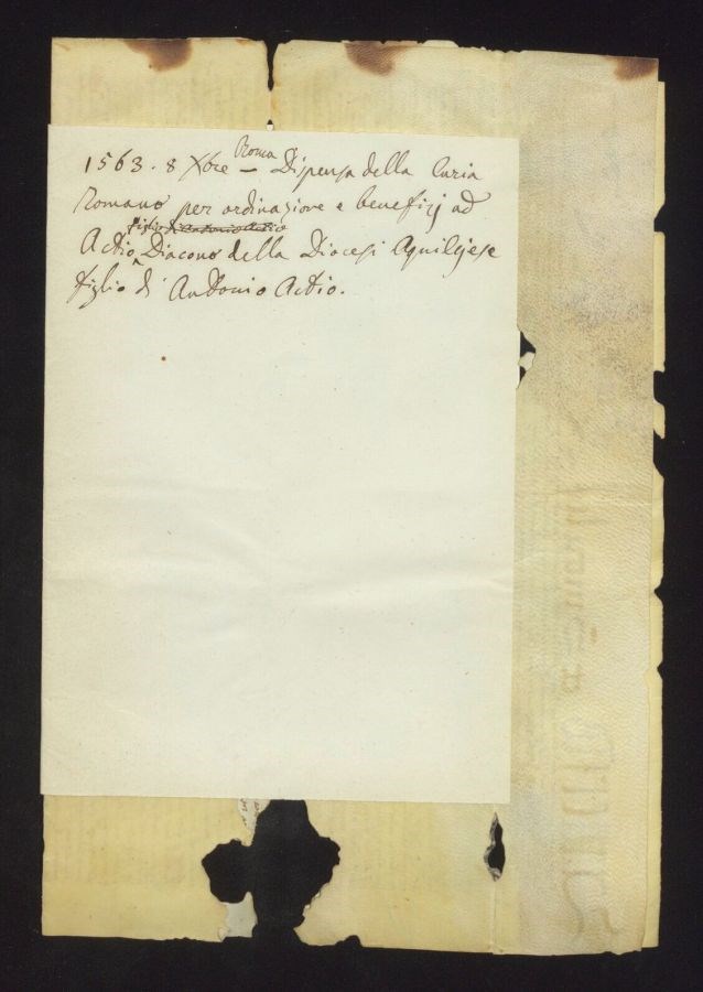 Dispensa della Curia Romana per ordinazione e beneficj ad Actio diacono della diocesi Aquilejese figlio di Antonio Actio