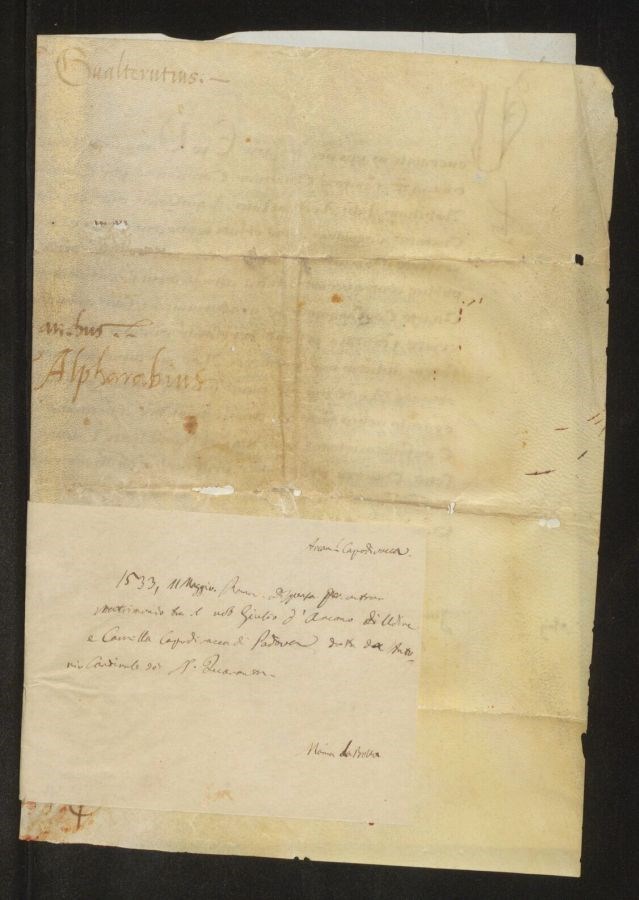 Dispensa per contrar matrimonio tra il nobile Giulio d'Arcano di Udine e Camilla Capodizucca di Padova data da Antonio Cardinale de' Santissimi Quaranta