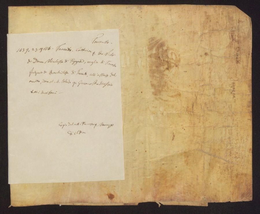 Catterina quondam ser Nicolò di Donna Miculussa di Fagagna, moglie di Francesco falzario di Brochiolosa di Tarcento, coll'assenso del marito, dona al nobile Orlando quondam Giacomo Radiussio tutti i suoi beni