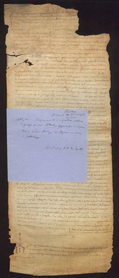 Non sono stati eseguiti interventi di restauro Importante lacuna in alto a destra; importante gora sul margine sinistro con presenza di lacune e strappi; inchiostro a tratti sbiadito nelle prime 17 righe