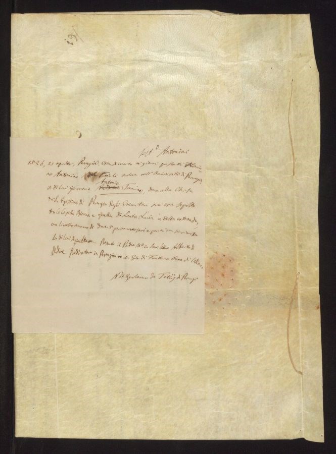 Essendo morto nei giorni passati Floriano Antonini del Friuli scolaro nell'università di Perugia il di lui Gennaro Antonio Tunino, dona alla chiesa di Sant'Agostino di Perugia degli eremitani ove era sepolto tra la capella bianca e quella di Santa Lucia a destra entrando, un livello annuo di ducati 5 per anniversari e perchè non sia rimossa la di lui sepoltura. Presente il padre maestro in sacre lettere Alberto di Udine predicatore in Perugia domino Giovanni di Fontanabona di Udine