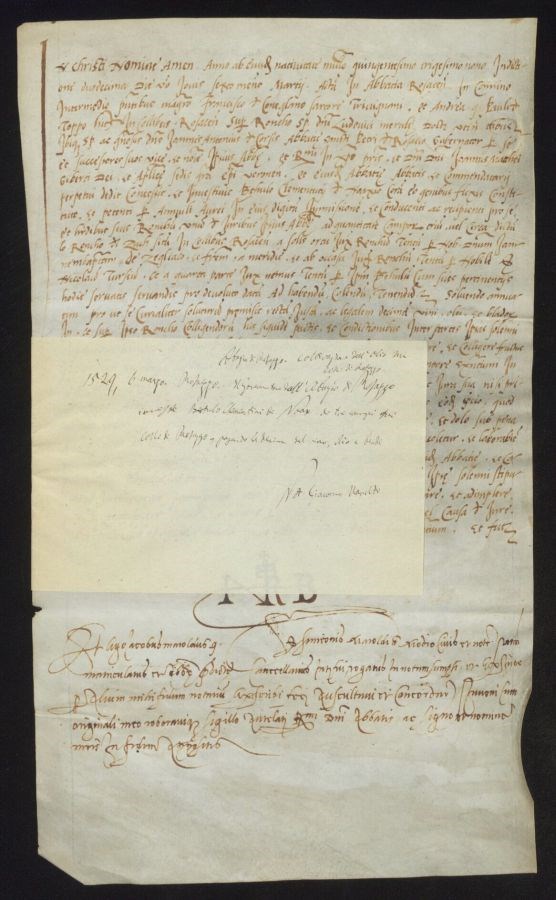Il Governatore dell'Abazia di Rosazzo investe Bertulo Clementini di Noax di tre campi sui colli di Rosazzo, pagando la decima sul vino, olio e biade