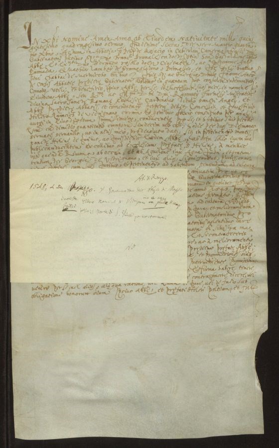 Nel regesto si parla dell'abbazia di Moggio, ma la data topica e un appunto in alto a destra sul cartiglio fanno riferimento a quella di Rosazzo