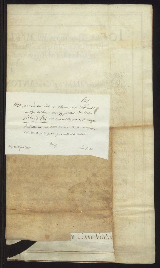 Federico conte Veterani certifica de' buoni servizij prestati dal conte Antonio di Pers volontario nel Reggimento di Corazze Rabatta ecc. nell'Assedio di Vienna ed altre campagne e che ora torna in patria per rimettersi in salute