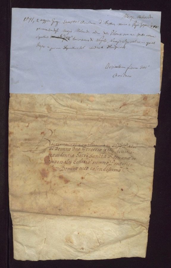 Ernesto l'Arciduca d'Austria scrive a Papa Gregorio XIV raccomandandogli Marzio Malacrida reduce dalla Polonia ove era stato come segretario dell'Arcivescovo di Napoli Nunzio apostolico in quel Regno e prima segretario del cardinale Radzivill