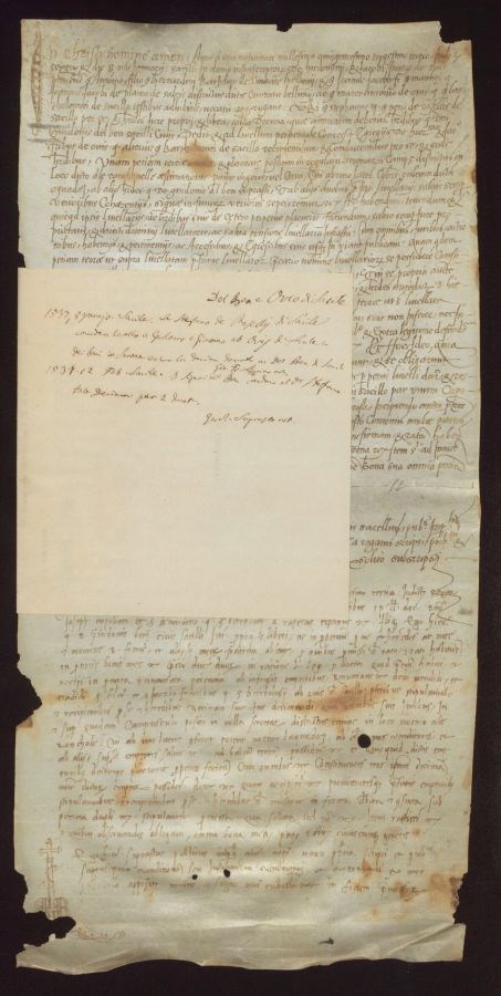 Regesto 1: Ser Stefano de Rasellis di Sacile concede a livello a Gerolamo e Giacomo ab Ovij di Sacile dei beni in Serone salvo la Decima dovuta ai Del Ben di Sacile Regesto 2: I Signori Del Ben vendono al detto Stefano tale Decima per 2 ducati
