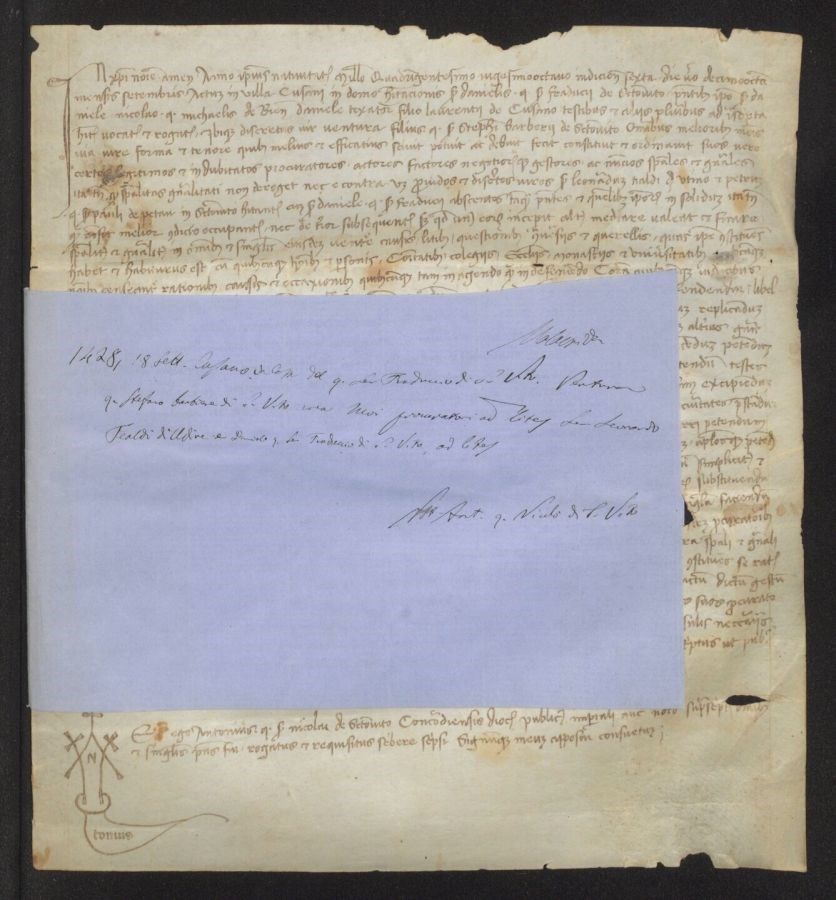 In casa del quondam ser Fraduccio di San Vito Ventura quondam Stefano barbiere di San Vito crea suoi procuratori ad lites ser Leonardo Tealdi di Udine e Daniele quondam ser Fraduccio di San Vito, ad lites