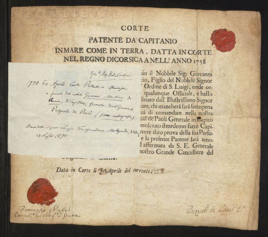 Patente a stampa a favore del nobile Giovanni Martini di Accio, di Capitano, firmata dal Generale Pasquale de Paoli