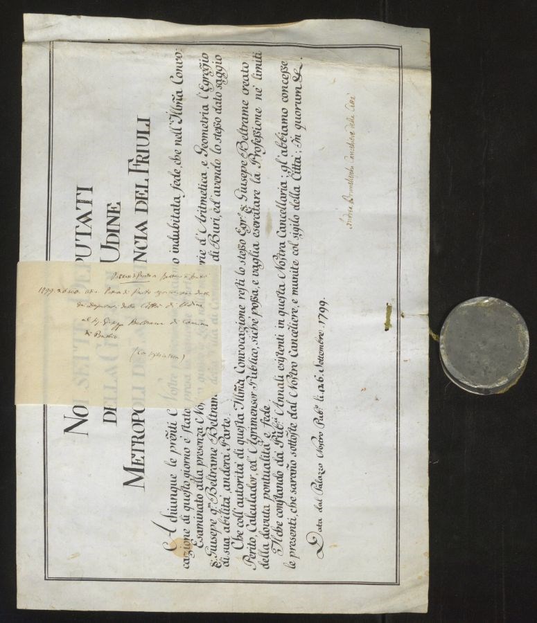 Patente di perito agrimensore data dai Deputati della Città di Udine al signor Giuseppe Beltrame di Camino di Butrio