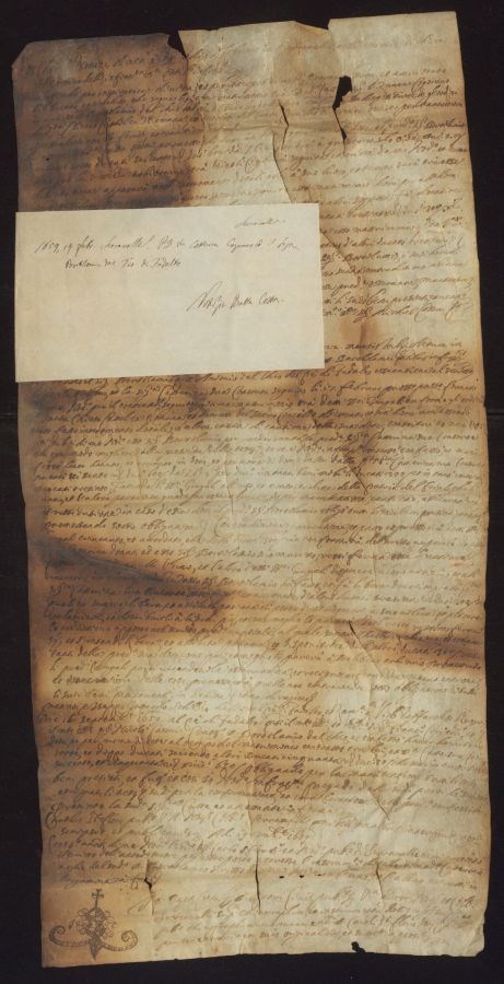 Non sono stati eseguiti interventi di restauro La pergamena è in pessimo stato, ma il testo è leggibile. Lungo tutta la fascia centrale del documento sono presenti dei piccoli tagli