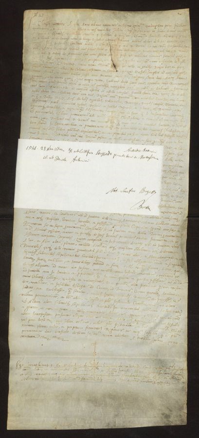 Non sono stati eseguiti interventi di restauro Sulla parte superiore della pergamena è presente un taglio trasversale; inoltre, l&39;inchiostro è scolorito
