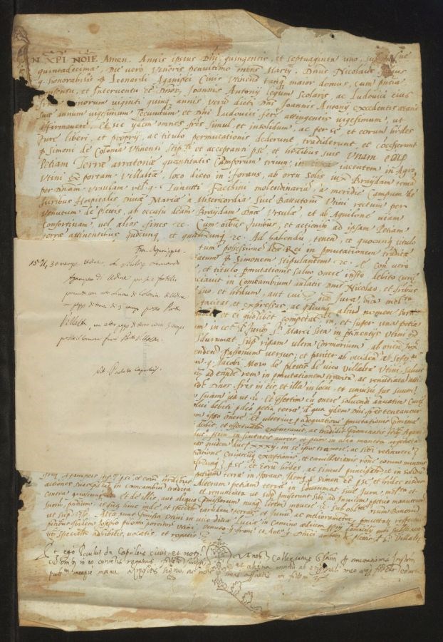 Ser Nicolò quondam Leonardo Aganipeo di Udine per se e fratelli permuta con ser Simone di Colonia di Udine un pezzo di terra di tre campi presso porta Villalta, con altro pezzo di terra circa tre campi presso il Cormor fuori porta Villalta