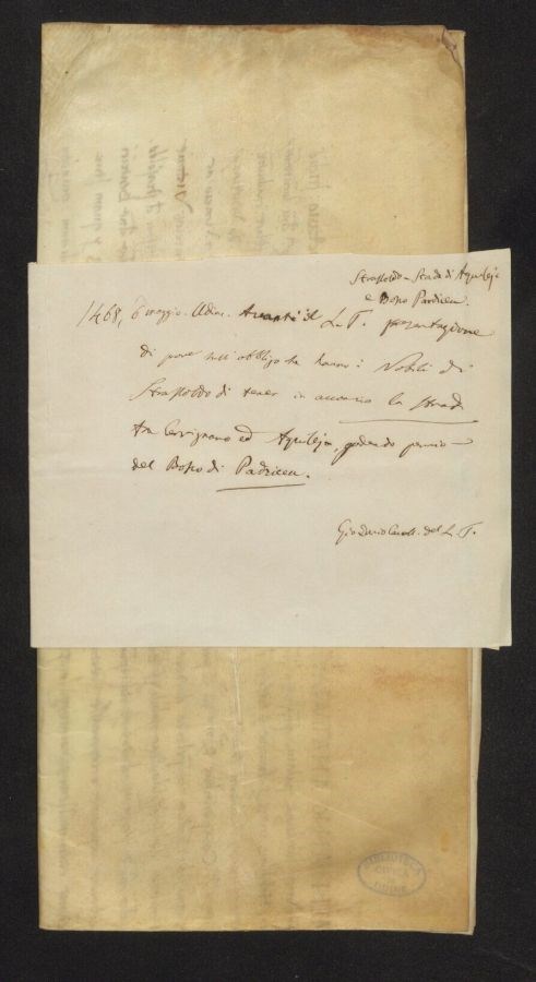 Avanti al Luogotenente presentazione di prove sull'obbigo che hanno i Nobili di Strassoldo di tenere in acconcio la strada tra Cervignano ed Aquileia, godendo premio del Bosco di Padricea