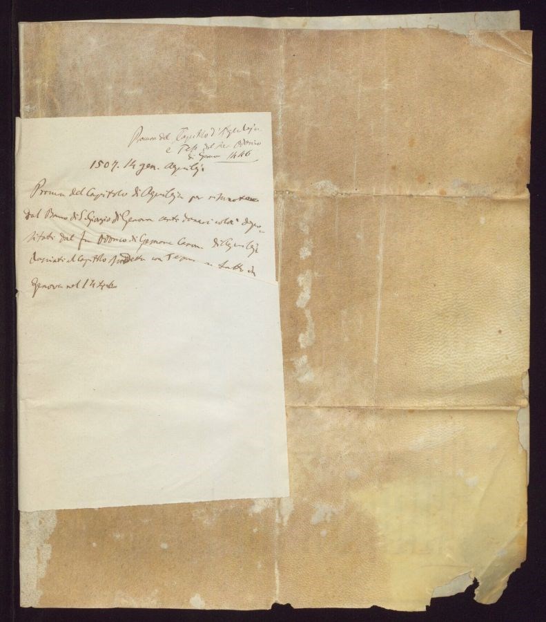 Procura del Capitolo di Aquileia per riscuotere dal banco di San Giorgio di Genova cento danari colà depositati dal fu Oddorico di Gemona canonico di Aquileia copiati al Capitolo suddetto con testamento fatto in Genova nel 1446