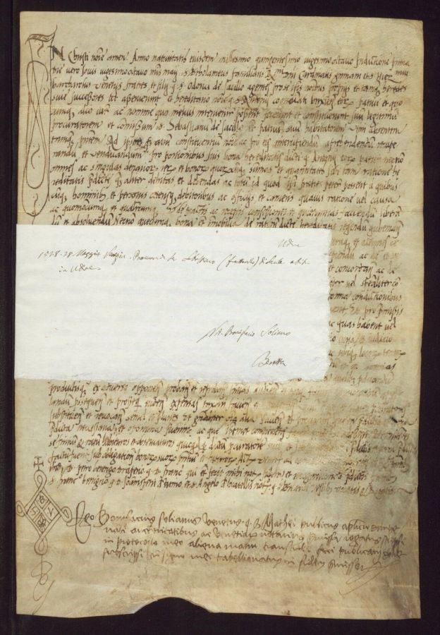 Non sono stati eseguiti interventi di restauro La pergamena è in buono stato, ma in alcune zone l&39;inchiostro è sbiadito e alcune aree del documento risultano di difficile lettura
