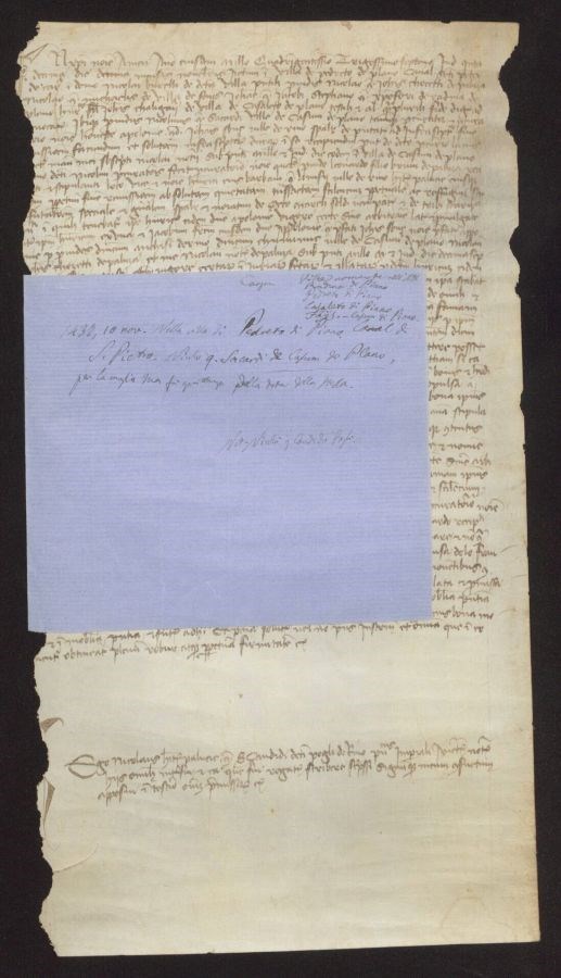 Nella Villa di Pedreto di Piano Canal di San Pietro Nicolò quondam Sacardi de Casum de Plano, per la moglie sua fa quietanza della dote della stalla