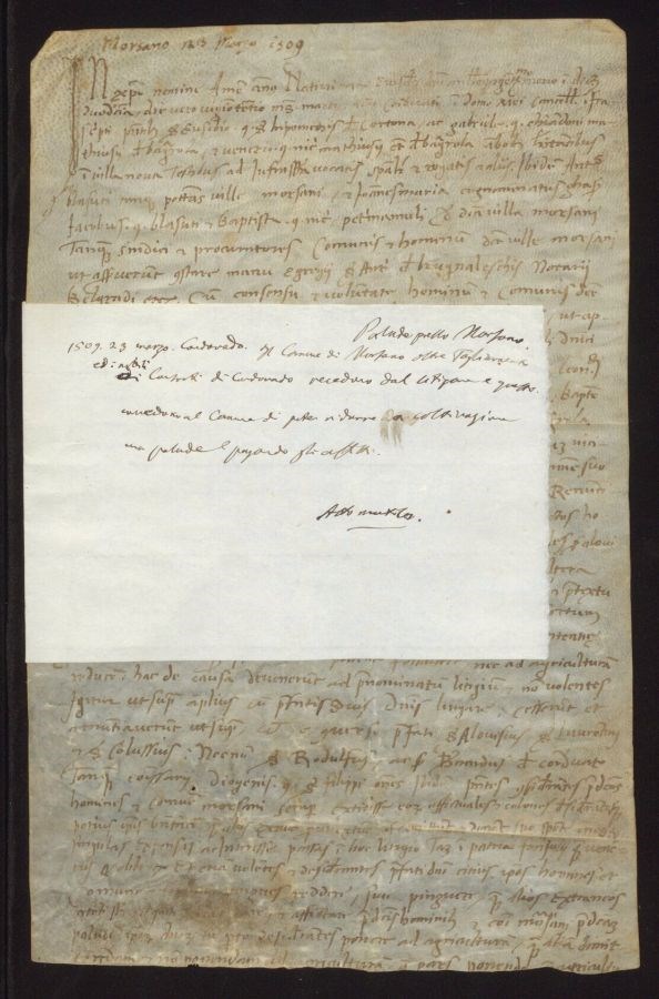 Il comune di Morsano oltre Tagliamento ed i nobili consorti di Cordovado recedono dal litigare e questo concedono al comune di poter ridurre la coltivazione una palude e pagando gli affitti