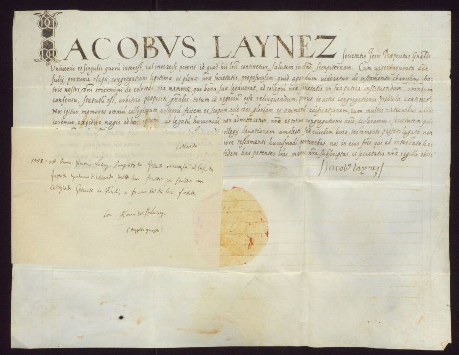 Giacomo Laynez preposito dei gesuiti rinunzia al lascito fatto da Gerolamo di Colloredo, della sua facoltà per fondere un Collegio dei gesuiti in Friuli, a favore de' di lui fratelli