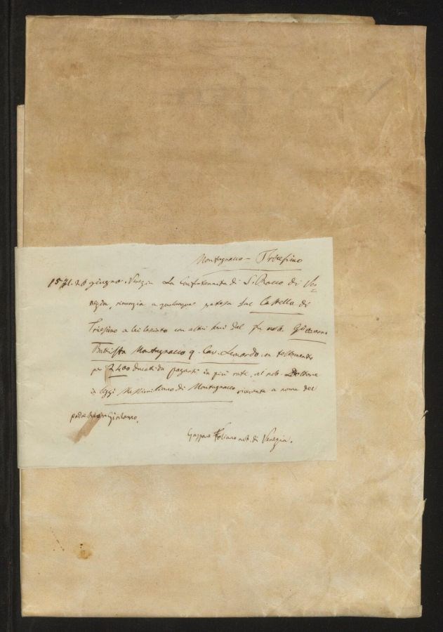 La confraternita di San Rocco di Venezia, rinunzia a qualunque pretesa dal Castello di Tricesimo a lei lasciato con altri beni dal fu nobile Giovanni Battista Montagnacco [i.e. Montegnacco] quondam cavalier Leonardo con testamento per 2400 ducati da pagarsi in più rate, al nobile dottore in leggi Massimiliano in Montagnacco ricevente a nome del padre suo Girolamo