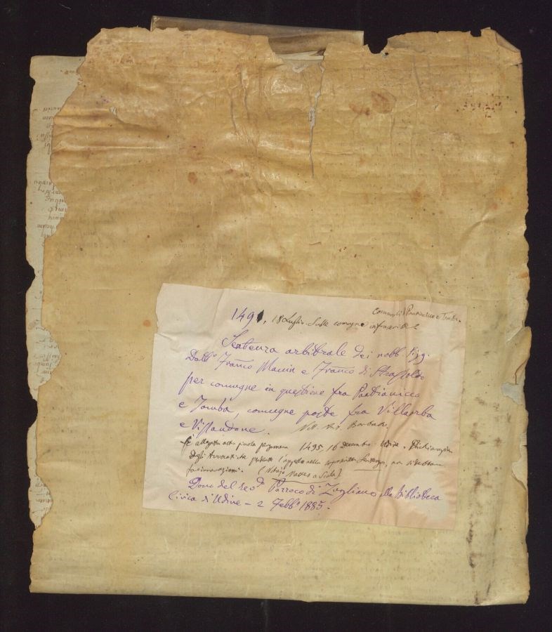 Regesto 1: Sentenza arbitrale dei nobili signori detto Francesco Manin e Francesdco di Strassoldo per comugne in questione fra Pantianicco e Tomba, comunque poste fra Villaorba e Vissandone.