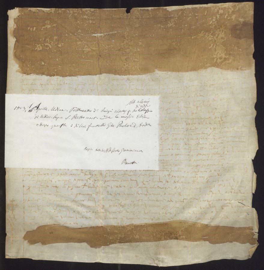 Testamento di Luigi Alereis quondam ser Colussio di Udine. Sepolto a San Pietro martire. Erede la moglie Elisa e dopo questa i di lui fratelli Giovanni Paolo e Andrea