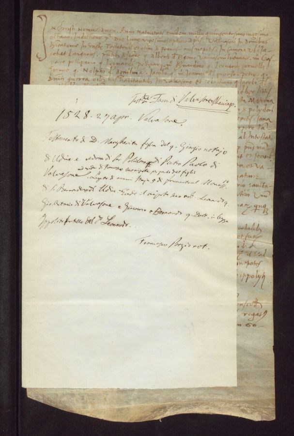 Testamento di donna Margherita figlia del quondam Giorgio notajo di Udine e vedova di Ser Polidoro di Pietro Paolo di Valvasone ed erede di Francesco suo nipote per parte del figlio. Legato di annui staja 5 di frumento al monastero di San Bernardino di Udine. Erede il nipote suo nobile Leonardo quondam Giovanni Antonio di Valvasone e Giacomo e Bernardo quondam dottore in legge Ippolito fratello del detto Leonardo