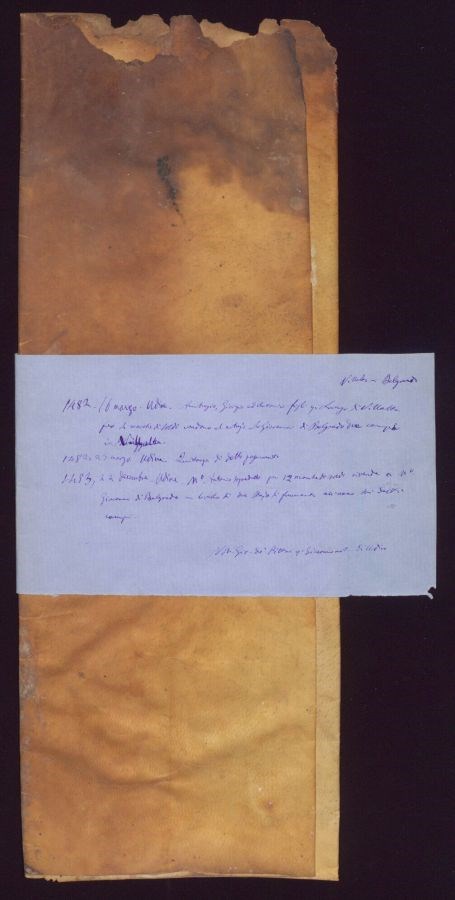Regesto 1: Ambrogio, Giorgio e Antonio figli quondam Lorenzo di Villalta per 4 marche di soldi vendono al notaio Ser Giovanni di Belgrado due campi in Villalta