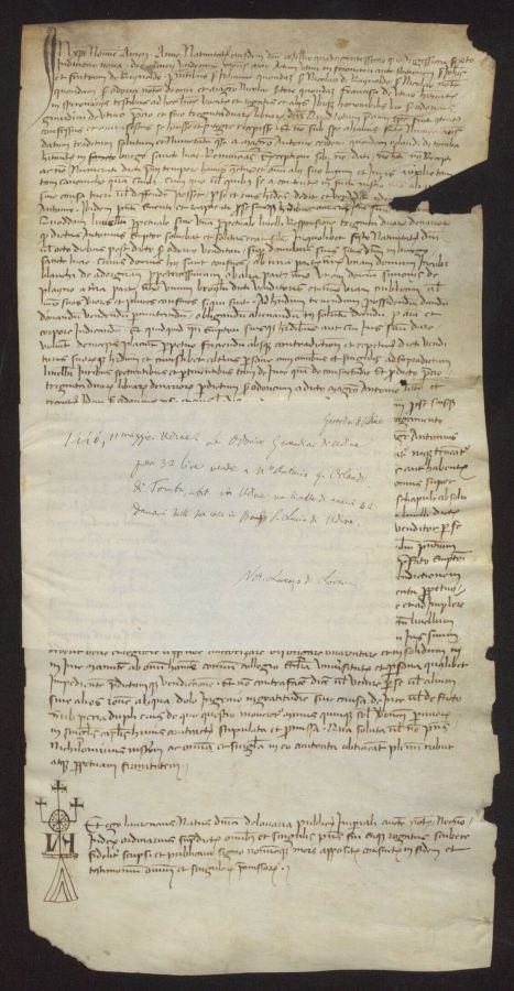 Ser Odorico Girardini di Udine per 32 lire vende a maestro Antonio quondam Orlando di Tomba, abitante in Udine un livello di annui 32 danari sulle sue case di Borgo Santa Lucia di Udine