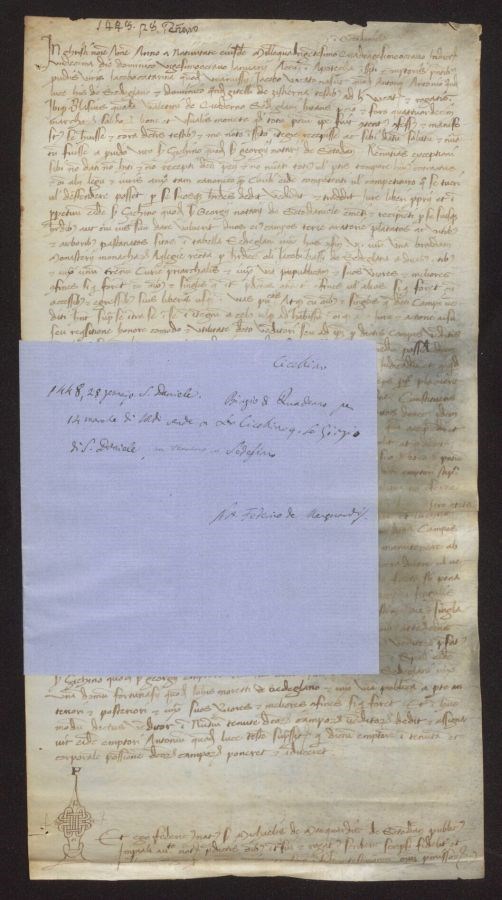 Biagio di Quaderno per 14 monete di soldi vende a Ser Cicchino quondam Ser Giorgio di San Daniele, un terreno in Sedegliano